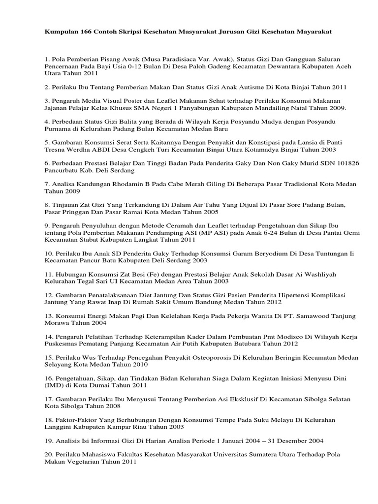 Judul Skripsi Gizi : Judul Skripsi Kesehatan Masyarakat Tentang Gizi Kumpulan Berbagai Skripsi : Kumpulan skripsi dengan topik gizi silakan lihat disini 1/aj hubungan antara peran ibu dan anak balita dalam kegiatan penimbangan dengan pengetahuan gizi di kelurahan x, kecamatan kendal, kabupaten kendal 1988 2/aj pengaruh penambahan air kapur dalam mencegah reaksi pencoklatan terhadap warna pati dan ampas serta rasa puding dan perkedel ampas kentang yang dihasilkan.. Skripsi dengan judul hubungan status gizi dengan kecerdasan intelektual pada anak sekolah dasar di sd kanisius pugeran tahun 2017. Analisis status gizi buruk dan gizi kurang pada balita di kota bengkulu tahun 2016 dosen pembimbing : Pola pemberian pisang awak (musa paradisiaca var. Daftar nama pembimbing dan penguji skripsi mahasiswa prodi s1 gizi ta 2017. Perilaku ibu tentang pemberian makan dan status gizi anak autisme di kota binjai tahun 2011.