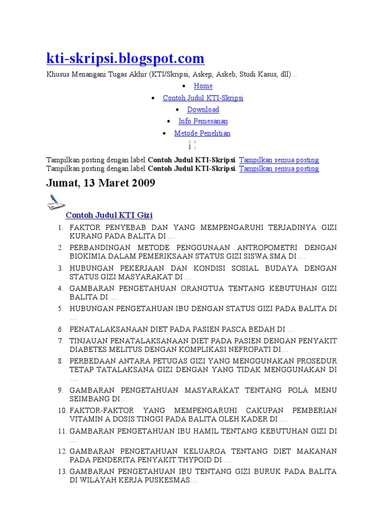 Karya tulis (44) makalah (74) contoh makalah (54) skripsi (116) contoh skripsi (5) judul skripsi (79) fakultas ekonomika dan bisnis (53) akuntansi (17) akuntansi keuangan (9) akuntansi perpajakan (7) ekonomi islam (8) manajemen (29) manajemen keuangan (9) manajemen pemasaran (5) manajemen sdm (12) fakultas ilmu. Maka sudah saatnya, kamu menyimak ratusan contoh judul skripsi yang terangkum dalam artikel 100 contoh judul gizi kesehatan masyarakat terbaik. Skripsi jurusan ilmu dan teknologi pangan fakultas pertanian. Daftar nama pembimbing dan penguji skripsi mahasiswa prodi s1 gizi ta 2017. Dokumen penelitian research document program studi s1.